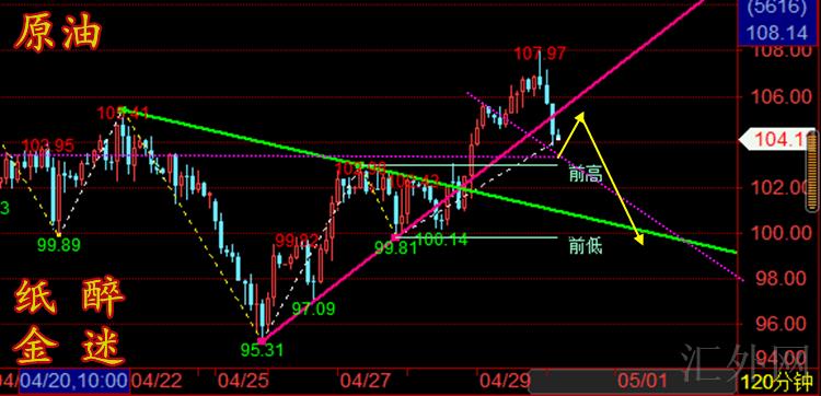 WTI原油星期五(4月29号)早盘开盘之出开盘适当下挫后上升,呈持续上涨,迟缓上升;美市盘中,原油扩暴升幅,创下日间高点107.949美元每桶,但仅刷新日间高点后立刻展开跳水下探,吐回全部升幅,并失守104.0关键点位位置,创下日间低点103.765美元每桶,截至收盘,原油自日间低点适当回涨,收回104.0关键点位位置,收盘在104.327美元每桶。