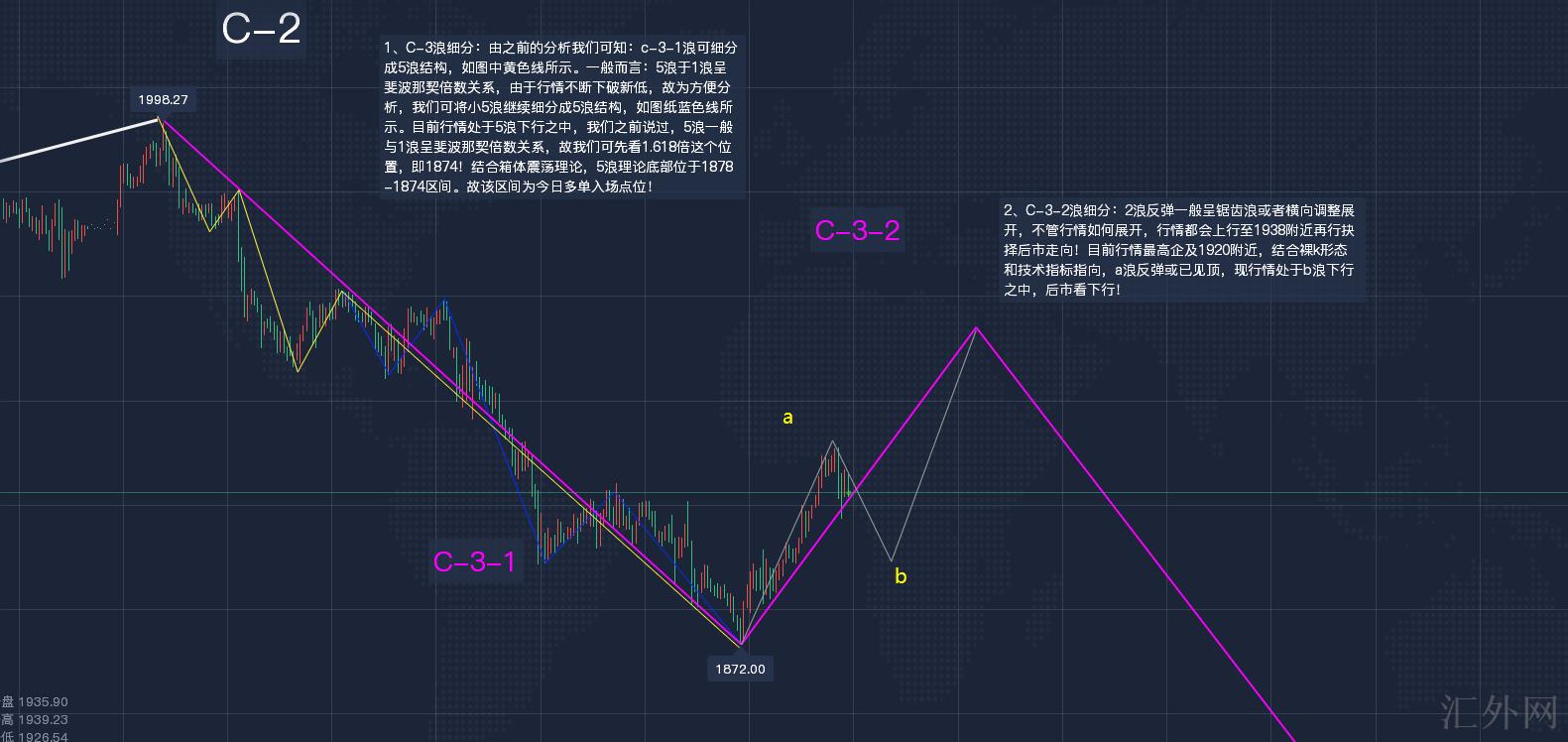 1、C-3浪细分:由以前的分析我们可知:c-3-1浪可细分成5浪结构,如图中黄色线所示。一般来说:5浪于1浪呈斐波那契倍数关系,受于行情持续朝下击穿新低,故为方便分析,我们可将小5浪持续细分成5浪结构,如图纸蓝色线所示。当前行情处在5浪下探当中,我们以前说过,5浪一般与1浪呈斐波那契倍数关系,故我们可先看1.618倍这个位置,即1874!结合箱体震荡理论,5浪理论底部位于1878-1874区间。行情按计划于该区间面临回弹,当前可看为处在c-3-2浪回弹当中!