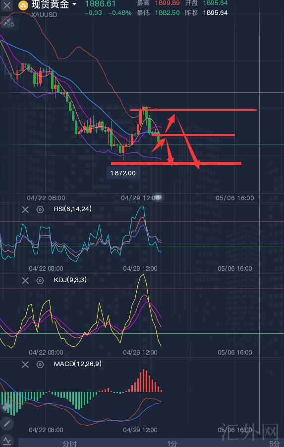 星期一(5月2号),黄金现货适当走软,当前交投于1887美元左右,上星期五美元从高点回调最多给黄金价格供应回弹机会,再加之M股暴跌,黄金价格最多回弹到1920美元左右,但市场目光依然聚集这周的美联储会议,市场广泛预计加息50个基点,而且这周也会面临非农等重量级经济报告,市场预计总体积极,美元买方头寸增长,黄金价格后市仍有更深一步回踩风险。