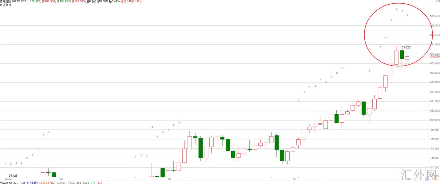 美元当前日K线位于序列8中,那么明日出9,恰好星期三adp报告那天变盘窗口。