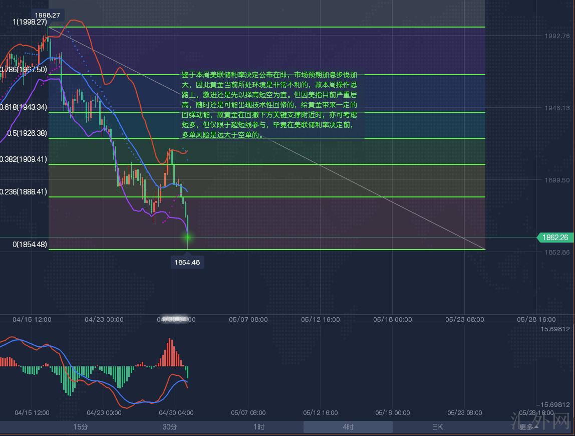 由于这周美联储利率决定发布在望,市场预计加息脚步加大,所以黄金目前所处环境是异常没好处的,故这周交易参考上,激进依旧先以择高短空为宜。但因美指当前严重居高,随时依旧或许显现技术性回修的,给黄金导致适当的回弹量能,故黄金在回撤以下核心支撑左右时,亦可斟酌短多,但仅限于超短线参与,毕竟在美联储利率决定前,多单风险是远大于空单的。