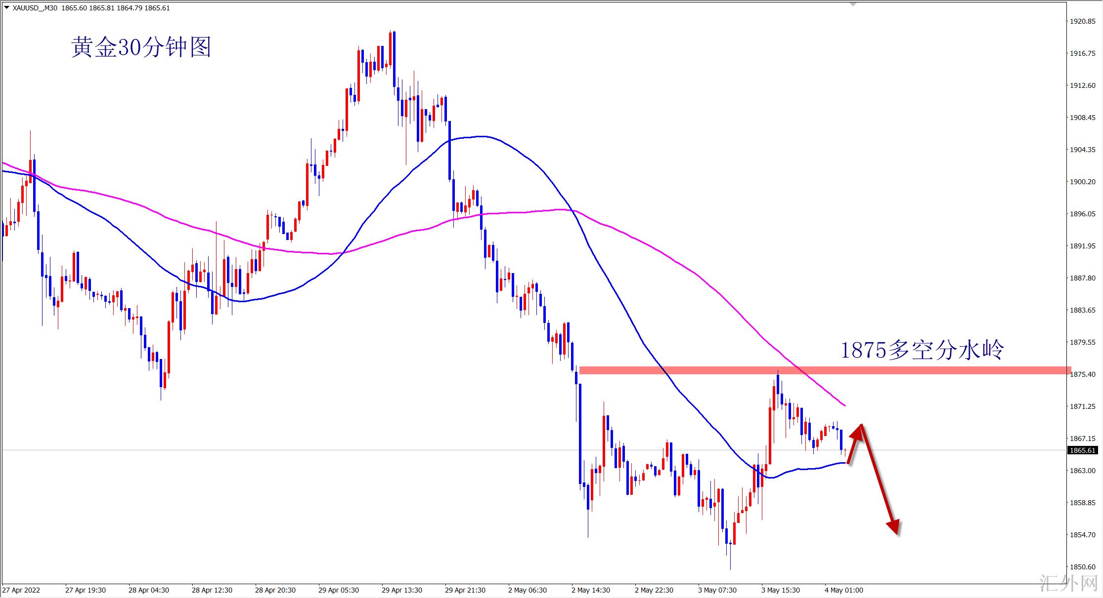 星期三(5月4号)亚盘时间,黄金现货震荡微跌,当前交投于1864美元左右,上一交易日受于地缘局势有所变糟,黄金价格在1850关键点位左右得到了一部分支撑,本交易日将面临美联储利率会议,大约率会加息50个基点,买方仍有所顾忌。但当前黄金价格已经部分消化了此次加息和将来多次加息50个基点的有好处空头影响,投资人需求注意“靴子落地”后的买方反扑。另外,本交易日仍需留心美国4月小非农就业人口变动和美国4月ISMPMI' 非制造业PMI报告,总体来说,利率会议前,黄金价格或许保持弱势,但对地缘局势的关注需求增强,利率会议后,黄金价格或许会引来震荡筑底甚至是震荡回弹的可能。鸽派会议结果或地缘政治紧俏局势升级或通货膨胀忧虑或许助推黄金价格重返每盎司1900美元。分析专员觉得,即使美联储的货币减缩才刚刚启动,但美债券市场场最严重的一次抛压或许已终结。这代表着美债收益率的上涨空间或许承受制约,甚至美债收益率会面临回踩机会,这有机会会减轻黄金价格的下探阻力。整体来说,本交易日普遍时期内,黄金价格仍或许会承受积极经济报告预计和加息预计的抑制,但市场观望情绪渐浓,地缘局势疑似有所变糟,黄金价格下探空间或许会承受制约,分别注意1850关键点位支撑和200日移动均线1835.4左右支撑。