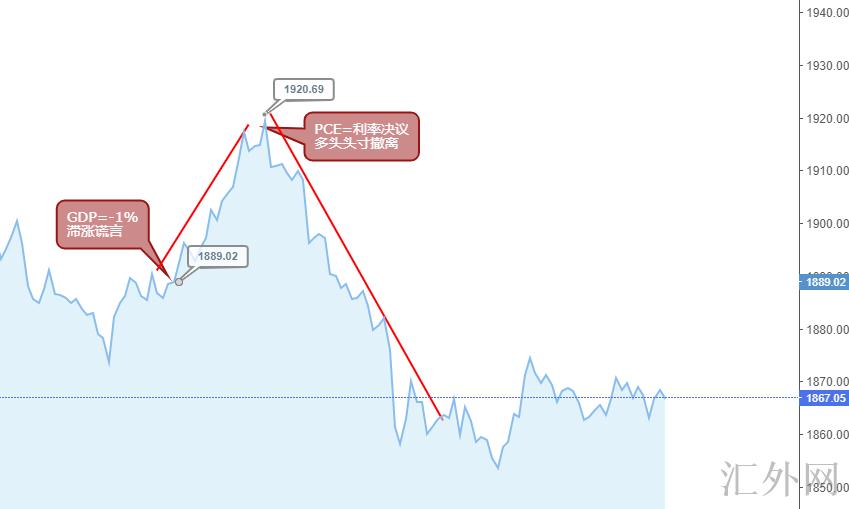 直到抛压到1872回弹时,再加之国内生产总值发布负数,加大了看多仓位的新押注,迎合着慢涨的黄金好像自己要又一次飞到2000点,而这个美梦在上星期五PCE报告发布后破灭,PCE是美联储关注的通货膨胀指标,而CPI是官方指标,在发布差于预计的那一刻,就等同于宣称了50个基点的加息。