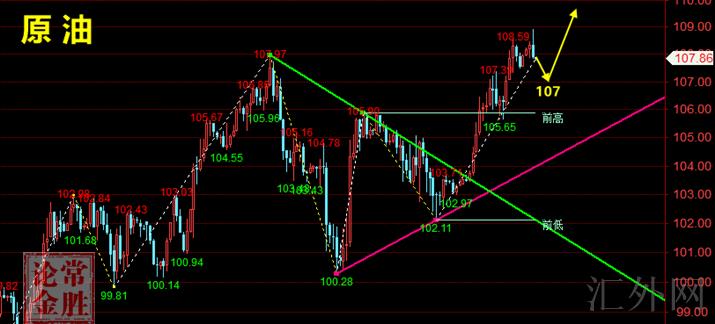 还记得周末文章中给的原油图形吗?当时提示当前处在三角区间震荡,上方回弹的高位依次减弱,以下支撑点于水平线95。从昨日的收线来说,已经击穿了前一个高位108,这表明三角区间往上击穿了。我觉得原油这次上升是承受了目前欧盟规划所有成员国禁止俄罗斯石油。既然市场选择了上升方向,我们所要解决的就是顺势而为,今日注意107-106区域回踩择机多。