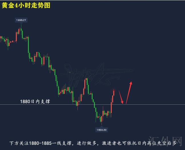 黄金技术分析来分析,日K线上,隔日黄金保持前一个交易日上涨趋势,又一次展开上涨,盘中刺破MA5日移动均线后回涨,报得带上下影线的中阳,日K线上,今日行情开盘持续依托MA5日移动均线展开上升,并刺破千九关键点位及MA10日移动均线,短时间预期有往上1920的机会性;4小时上,隔日黄金经历短时间的盘整后走震荡上涨行情,今日并保持,刺破上缘,目前布林带马上开口,MA均线迈出双金叉,KDJ随机指标三线向前,到达超买,MACD指标红色量能柱连续放量,快慢线金叉往上,综合来说,黄金当前刺破千九,日间耐心等候回撤1880-1885一线支撑执行买涨,激进派也可依托日间高点执行先空后多。