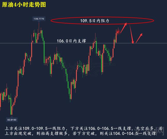 原油技术分析来分析,日K线上,隔日原油亚盘适当刺破MA10日移动均线后展开回涨上升,盘中报得大阳,日K线上,今日行情开盘持续上涨,原油马上面对前高,在没有击穿的情形下短时间内仍有机会性回踩又一次依托MA5-10日移动均线上升;4小时上,隔日原油走高,走迟缓上涨,持续上升,目前布林带马上开口,MA均线迈出双金叉,KDJ随机指标三线向前,到达超买,MACD指标红色量能柱连续放量,快慢线金叉往上,综合来说,日间原油切勿高点追多,推荐先空后多,上方注意109.0-109.5一线压力,以下注意106.0-106.5一线支撑,若上方显现击穿,则顺势抬高支撑买涨,若以下显现击穿,则注意104.0-104.5一线支撑又一次买涨。