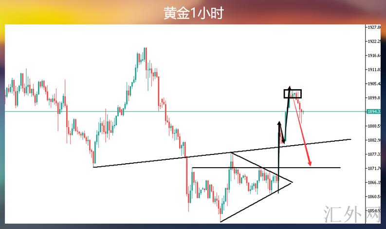 如图所示,整个击穿就是从内敛三角形开始的,而且在往上击穿以前,黄金还先向下摇摆了一次,直到后续强劲击穿回补趋势线,并以短时期内回踩持稳的方式再次奔向1900,可是百元关口并没有再次引起买方做多盘,在这里已经显现了回踩态势,依照初始回踩需求,第一个点肯定是1880,其次才是原本底部横盘的水准位1870,也就是说今天你看空,保守来讲也有20美金的利润度,就算凌晨底部有被套的仓位也不用着急,你完全可以依托95左右去做参与加仓,随后到70左右走人,如此不就完美处理了交易被动困扰吗?