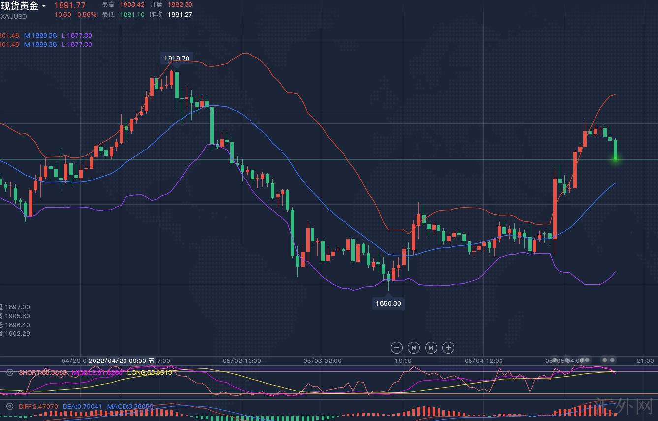 ①、黄金先谈加息结果:美联储宣称加息50个基点以及逐渐缩债,属于有好处空头信息,但黄金却是摸底回弹大幅上升到达咱们预计1900高位,原因有二:第一加息结果与市场预计统一,并没有惊喜,市场前期的炒作卖方已经完成下挫。第二:盘面日中K线收摸底十字阳线,显示以下支撑强势,有持续上升的量能,所以加息结果没有惊喜,各投资人在当前局势不稳的情形下再次让黄金买方起飞也是情理当中。