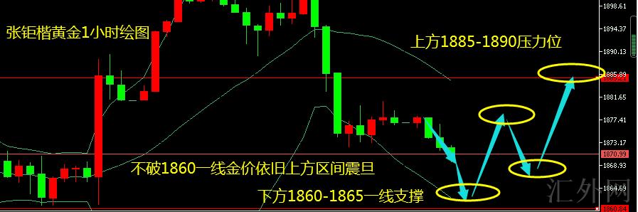 第一:4小时的行情图临时是走跌位的区域震荡,上方是1910-1920的阻力位置,以下是1850的支持点置,以及1860的支持点置,所以,4小时是形成的2个区间震荡行情。