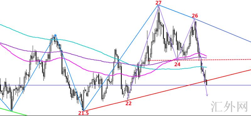 白银最近最高打击27关键点位遇阻回调,受美联储加息影响,日K线面临十连阴下跌趋势,而且成功打开布林下缘空间,MA5—MA10均线保持死叉下探抑制,MACD也是保持绿柱能放量状态。月线层面也是冲顶回调大阴收尾,奠定了五月份下跌趋势;当前受美联储加息刺激,依托22关键点位面临回弹回涨到23关键点位,然而好景不长,冲顶23关键点位遇阻回调,又一次跌至22关键点位左右。今日操作上持续空,回弹22.8左右空,以下注意21.5—22区间支撑。