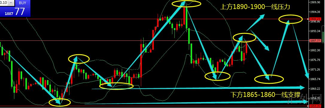 黄金:黄金当前是走的1小时的区域震荡,上方是1900的阻力位置,下面的支持点置是1860的位置,所以是1900-1860的星期五区间震荡行情了。靠差不多1875上下激进点短多,上面靠差不多1890-1895短线沽空。
