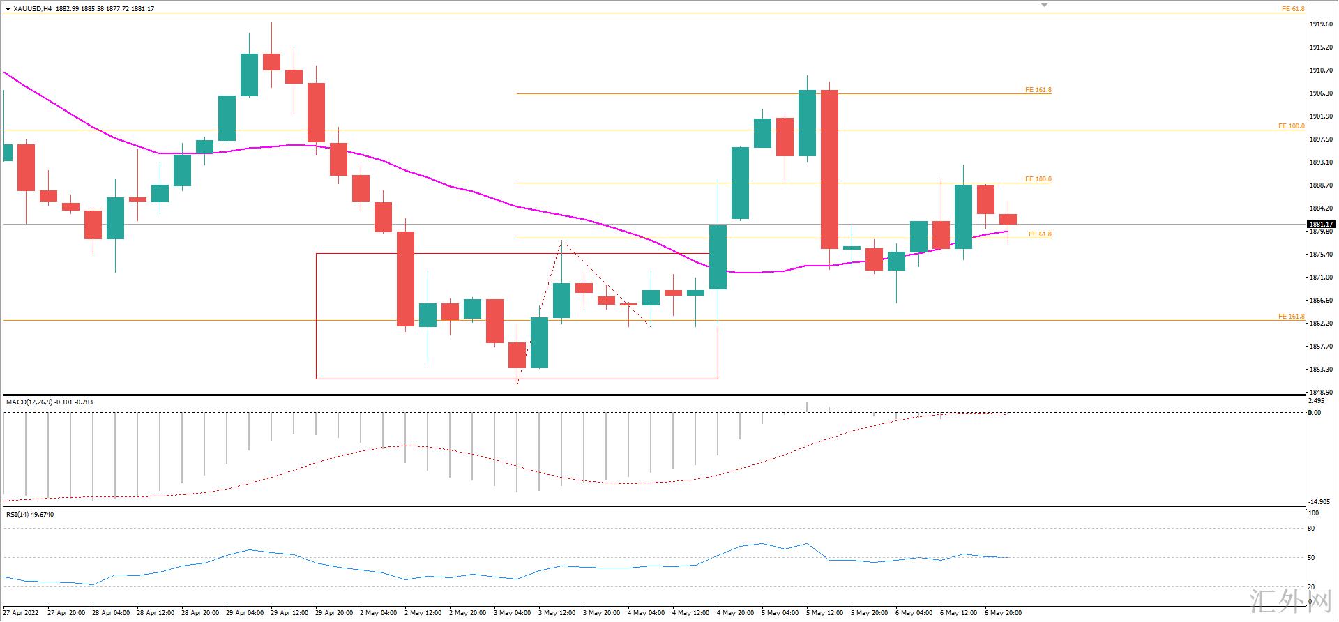 黄金前交易日上下拉扯,日K线收阳锤,今日亚盘价格持续回调。盘面向上瞧,价格任然在技术分析20移动平均线和斐波那契延展线1880.0左右有一定支撑。4小时图上MACD和RSI均没有特别显著的多空信号,日K线级别任然为看空头的态势。所以,激进的交易者可以斟酌,日间在支撑点谋求低多的可能,随后在高点从新看跌,需求灵活操作。