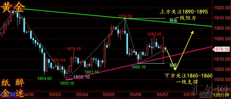 上周美联储宣称5月利率会议,和市场预计统一,此次会议加息50个基点。黄金依托1860关键点位支撑强劲回涨到1900关键点位,然而上涨趋势也未能保持,而是遇阻1910之下反复深V洗盘,多空无清晰方向还处在激烈争夺当中。星期五非农日黄金亚欧盘下探1866低位回弹,报告发布后冲顶1890面临迅速下探,看似有希望跌穿1872支撑,但是保持性依旧较差,午夜震荡慢涨创下非农高位到1893名置,最终跌至1882名置收尾。黄金最近均为反复过山车行情,节奏比较乱,没有什么规律可言,多空起伏不定。
