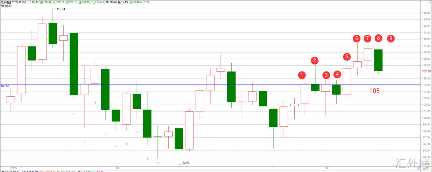 所以,我认为黄金当前是跟着原油在震荡,原油当前不能跌穿的位置在105这里,由于从日K线来看的话,105这里假使说跌穿的话,那么日K线的序列会消失。