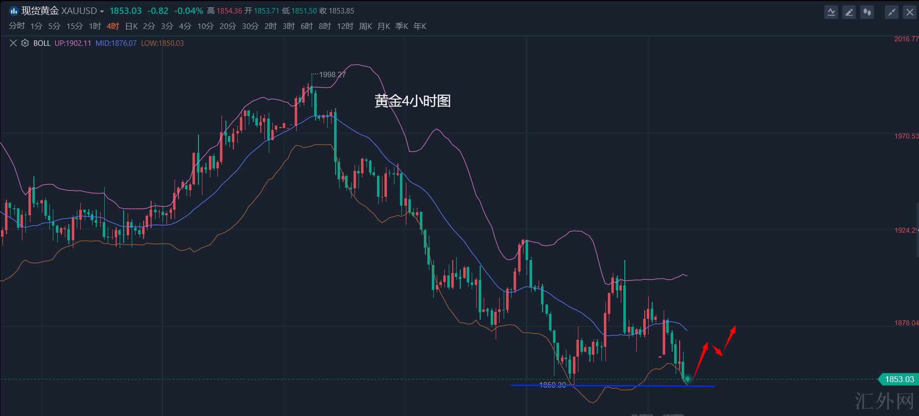 黄金技术分析分析:从黄金日K图看,黄金星期一开盘在1882美元左右,亚盘黄金直接走软显现一次下挫,行情最低下探刷新到了计划点位1867美元左右,随后止跌开始震荡回弹,如此的行情往往都伴伴随回弹。而今日关注点就是上周低位1850一线,假使跌穿价格直接走弱下挫,未跌穿金价仍有回弹的可能。受于KDJ已经低点初始金叉,另外100日移动均线1883.40又一次转化为初始压力所在。4小时级别震荡;留心布林线轨道1850-1900区域击穿情形;当前KDJ朝下发散,MACD初始死叉,留心1850左右支撑,假使失守该位置,则短线倾向再次跌到1822左右,是否更深一步朝下击穿,仍有待观察。