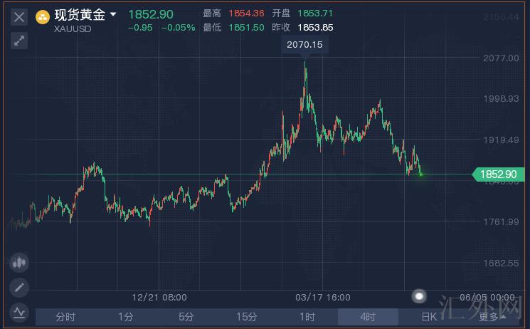黄金消息面解析:星期一(5月9号),环球黄金价格走跌,因美元指数续创创2002年12月中旬以来高点到104.107,以美元计算的黄金对其余货币持有者吸引力减弱,美联储官员否认加息未跟上节拍一说,理由是在美联储3月份开始加息以前金融情况就已开始缩紧。受于对利率上涨的忧虑日益加重,投资人谋求持有美元,美指盘中创2002年12月中旬以来高点到104.107.而10年期美国国债收益率星期一升到2018年11月迄今的最高水平,牵累了非孳息资产黄金的单价。美联储激进加息、提速量化减缩进度、美元走高以及乌克兰局势或许显现的缓和,全会使黄金价格上涨面对压力。