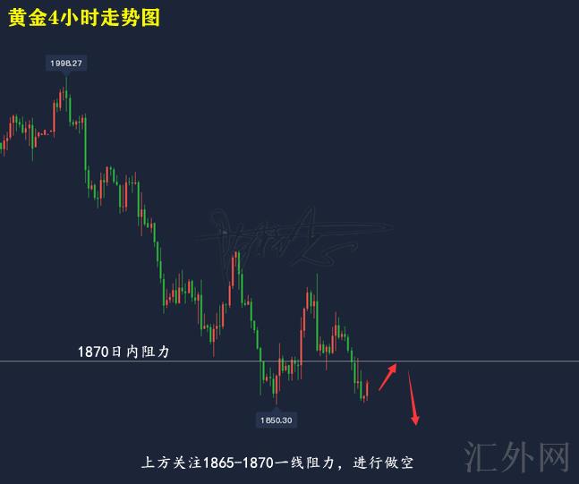 黄金技术分析来分析,日K线上,隔日黄金开盘适当刺破MA10日移动均线后展开下探,盘中连续下挫,报得实体大阴,日K线上,今日行情开盘适当回涨,但均线抑制较强,日间仍有下探机会;4小时上,隔日黄金走震荡下探行情持续下挫,持续跌朝下轨创下低,目前布林带处在开口期,MA均线三线朝下,KDJ随机指标三线往上,到达超卖,MACD指标绿色量能柱连续放量,快慢线死叉朝下,综合来说,日间黄金推荐持续维持买跌,上方注意1865-1870一线压力。