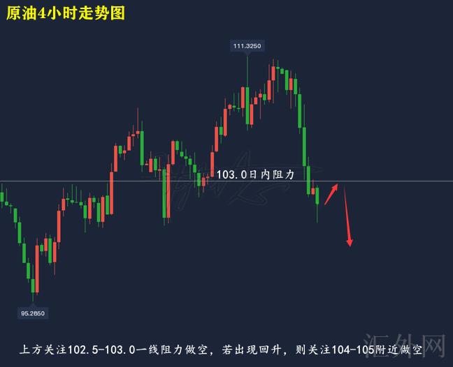 原油技术分析来分析,日K线上,隔日原油遇阻上缘位置展开下探,盘中报得实体大阴,并刺破中轨位置,均线形成抑制,日K线上,今日行情预期恐会下挫;4小时上,隔日原油走震荡下探行情,持续下挫,盘中持续刺破下缘创下低,今日并保持,目前布林带处在开口期,MA均线三线朝下,呈卖方排列,KDJ随机指标三线朝下,到达超卖,MACD指标绿色量能柱连续放量,快慢线死叉朝下,综合来说,日间推荐维持买跌,上方注意102.5-103.0一线压力,若显现回涨,则在依托104-105左右买跌即可。