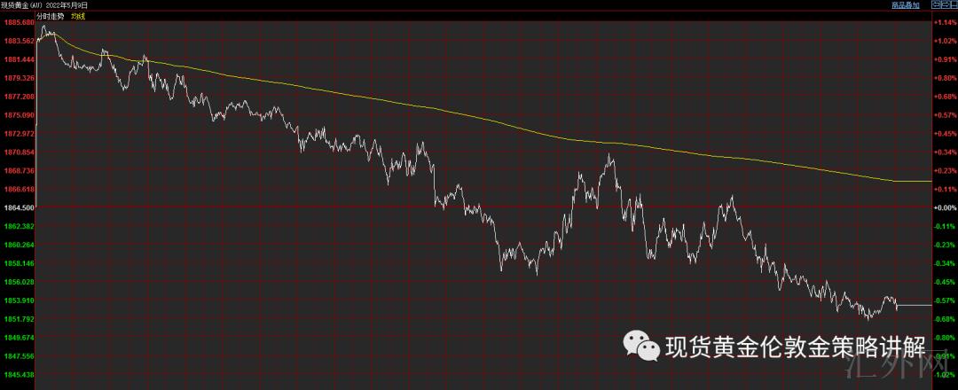 星期一(5月9号),环球黄金价格走跌,因美元指数续创创2002年12月中旬以来高点到104.107,以美元计算的黄金对其余货币持有者吸引力减弱,美联储官员否认加息未跟上节拍一说,理由是在美联储3月份开始加息以前金融情况就已开始缩紧。受于对利率上涨的忧虑日益加重,投资人谋求持有美元,美指盘中创2002年12月中旬以来高点到104.107.而10年期美国国债收益率星期一升到2018年11月迄今的最高水平,牵累了非孳息资产黄金的单价。美联储激进加息、提速量化减缩进度、美元走高以及乌克兰局势或许显现的缓和,全会使黄金价格上涨面对压力。
