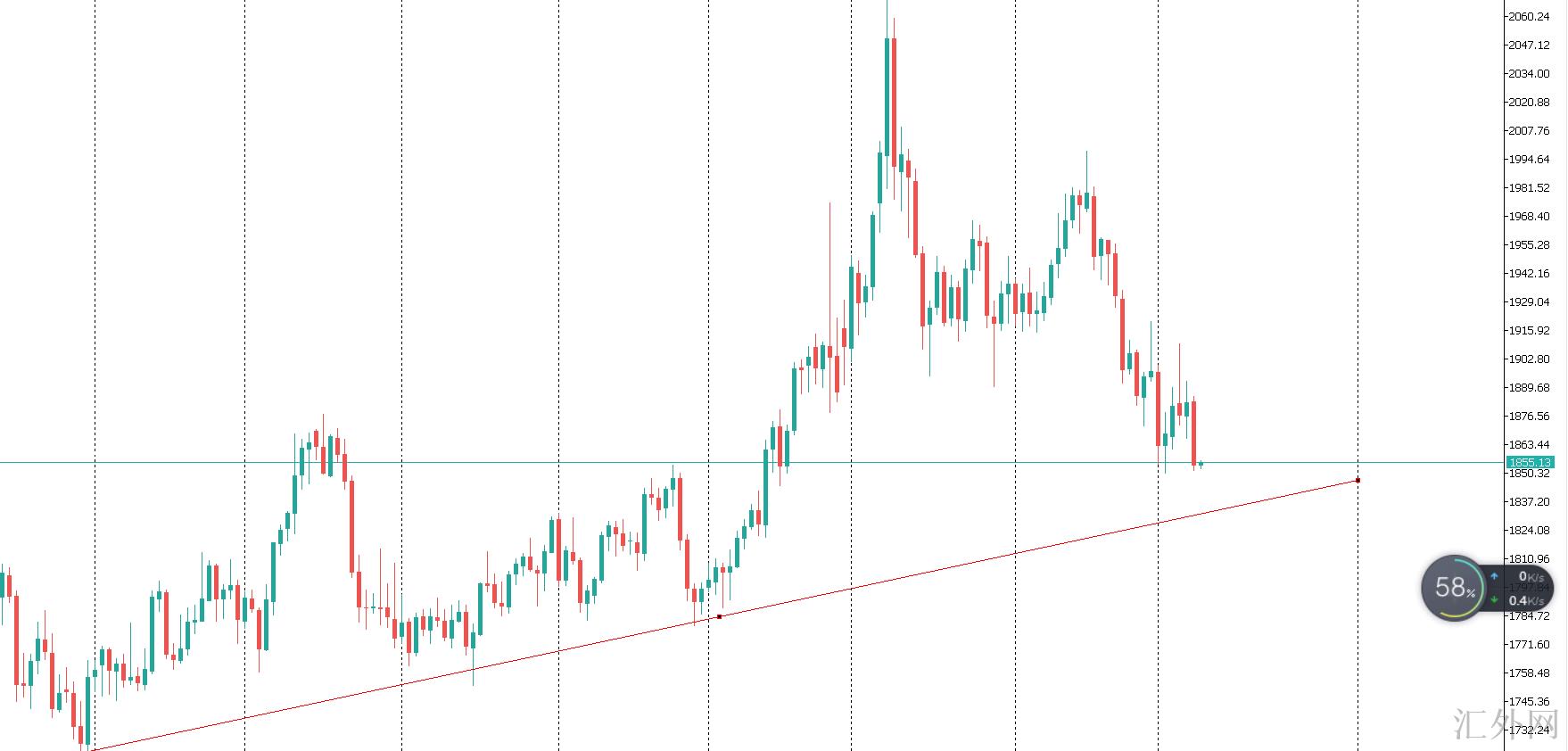 环球黄金日K图向上瞧,黄金在星期一收取大阴线,差不多不带上下阴线,表明卖方依然比较强劲,收盘1851,回弹比较有限,当前黄金价格争夺的是1850的一个阶段分界线,换言之,一旦跌穿1850,以下空间又一次创下,日K线来说阻力首要来自均线1870-75一线,以及经线1890压力,而支撑则首要注意1850,突破则以下试探1830,该位是21年8月9号至现今的趋势线支撑;而1830以下支撑则位于1800一线,而最终大盘可在1785到底!