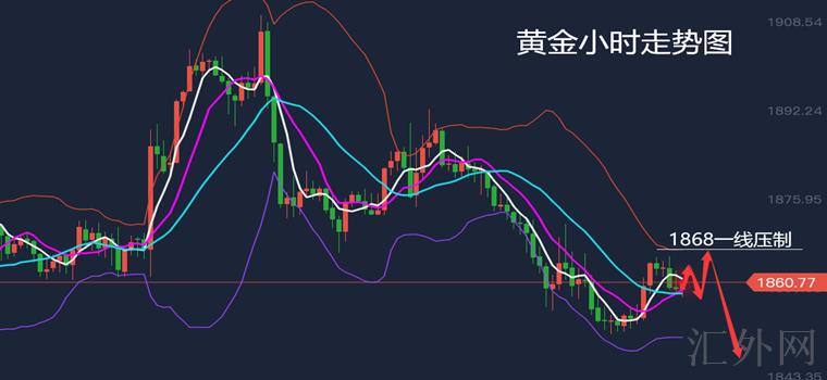 黄金小时线级别,隔夜一路打压弱势,收盘于低点1853一线,今日亚盘未先续跌,而先反抽修正一次,则午后或欧盘前后要跟空一次,选择位置参考昨日整体降幅382分割位置1865一线,也是凌晨遇阻点起到一定双顶共振抑制,此外1909.6-1892.4短时间连接的趋势阻力线对应的衍生遇阻点1868下也有不错的抑制,属于昨日整体降幅反抽50分割位置,所以今日1865-68均为买跌点,以昨日美盘开跌口1871-72作为风水岭防守,看底部弱势整理为主,以下支撑注意1855-54,具备一定小趋势线支撑作用,朝下击穿1850则失利,临时参考1850-1870规模内运行操作;不管是朝下击穿1850依旧往上击穿1872全将有适当的保持过程,若朝下击穿1850,则注意1840-35;反之,往上击穿1872,则注意1881和1892两处;