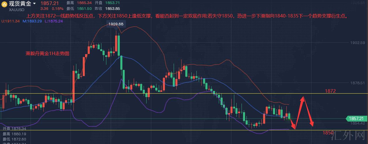 技术分析:昨日星期一日K线大阴回撤,以下最低刷新1850一线,收盘收线在1854左右,依然是属于较弱的收盘形态,日K线级别卖方得到保持。黄金日K线级别,昨日收报一根较长上影倒垂头阴K线,任然刷新10均线抑制回调,站不稳它,短时间则保持弱势底部运行;然而,1850逢低点置处在前期趋势支撑线上,今日亚盘仍未直接续跌走软,显示还存在底部持续弱势整理的过程,上方注意1872一线趋势线反压点,以下注意1850上逢低支撑,看是否起到一定双底作用;若失守1850,恐更深一步下跌指向1840-1835下一个趋势支撑衍生点。