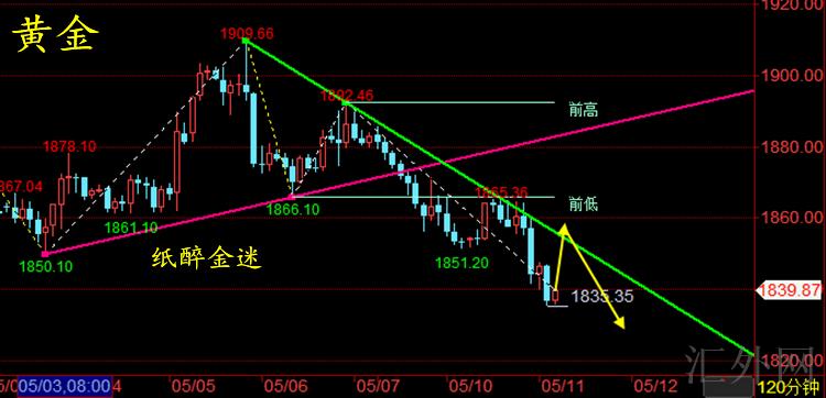 当下黄金跌穿1840关口,从回弹强度来说很弱,日K线MA10始终抑制黄金价格的回弹,所以不破日K线MA10名置,卖方思路就不变,往上击穿我们再调动思路就好,当前是黄金的单边下挫,预期低位是月线的支持点置在1830-1825区域,到达次区域的时机我们就不要追空了,恐怕会有一个技术分析的回弹修复,到时还可以短多一下。所以,这里我认为1830这里可以作为抄底的位置,但是预期不会在今夜,大约率在明日早盘时段。假使说一旦,在1830这里开始来回弹,我认为大约率会很强劲,而且很有机会下半周会直接到1880-1890去,直接到破这周开盘高位位置。综合来说,今日黄金短线操作上纸醉金迷推荐回弹买跌为主,回踩买涨为辅,上方注意1850-1855美元一线压力,以下注意1825-1830美元一线支撑;
