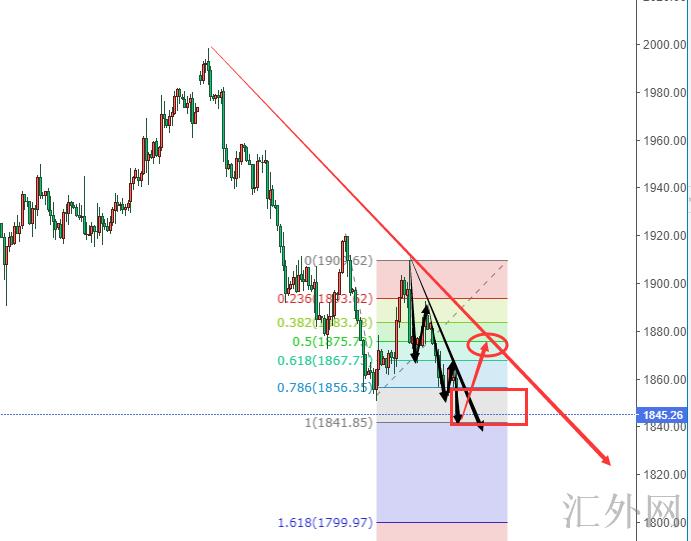我问你,你认为1867跌到1840算多吗?日间交易来讲肯定算,但昨天的低位是56!也就是说今天新低程度其实并没有大!而且整个调动下挫的最终100%位置是在1841,假使今天能在这里终止,黄金大约率会先开放41与56之间的平盘震荡,本来下挫曲线就已经到末端了,它也没有又一次痛跌拉开距离,所以很容易震荡出局第一黑色下挫曲线。
