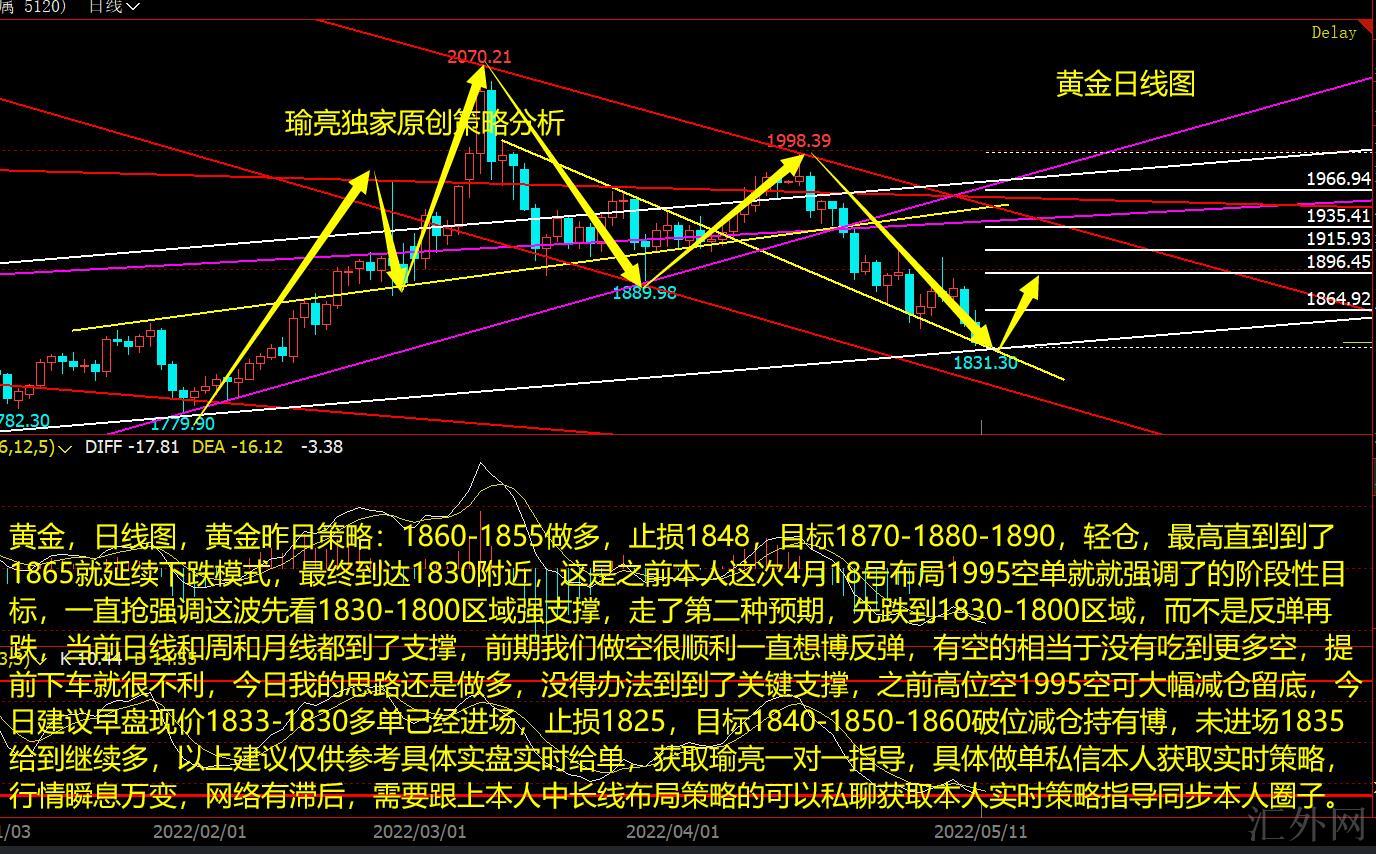黄金,日K图,黄金昨日策略:1860-1855买涨,止损1848,计划1870-1880-1890,轻仓,最高直到到了1865就保持下挫模式,最终到达1830左右,这是以前本人这次4月18号布局1995空单就就强调了的阶段性计划,一直抢强调这段先看1830-1800区域强支撑,走了第二种预计,先跌到1830-1800区域,并非是回弹再跌,目前日K线和周和月线都到了支撑,前期我们买跌很顺遂一直想博回弹,有空的相当于没有吃到许多空,提早下车就很没好处,今日我的思路依旧买涨,没得办法到到了核心支撑,以前高点空1995空可大幅减仓留底,今日推荐亚盘现价1833-1830多单已经进场,止损1825,计划1840-1850-1860突破减仓持有博,未进场1835给到持续多,以上推荐仅供参考具体实盘实时给单,获取瑜亮一对一指导,具体做单私信本人获取实时策略,行情瞬息万变,网络有落后,需求跟上本人中长线布局策略的可以私聊获取本人实时策略指导同步本人圈子。