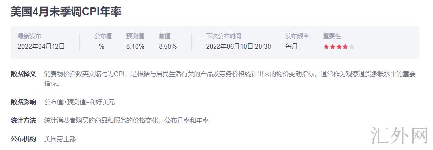眼下有比这些更重要的报告适合我们关注,今夜市场将发布美国4月CPI通货膨胀报告(CPI又名消费物价指数,是与居民生活相关的产品及劳务价格统计出来的物价变动指标,一般作为观察通胀重要的指标。)目前市场预计此数据将报8.1%,差于前值的8.5%。