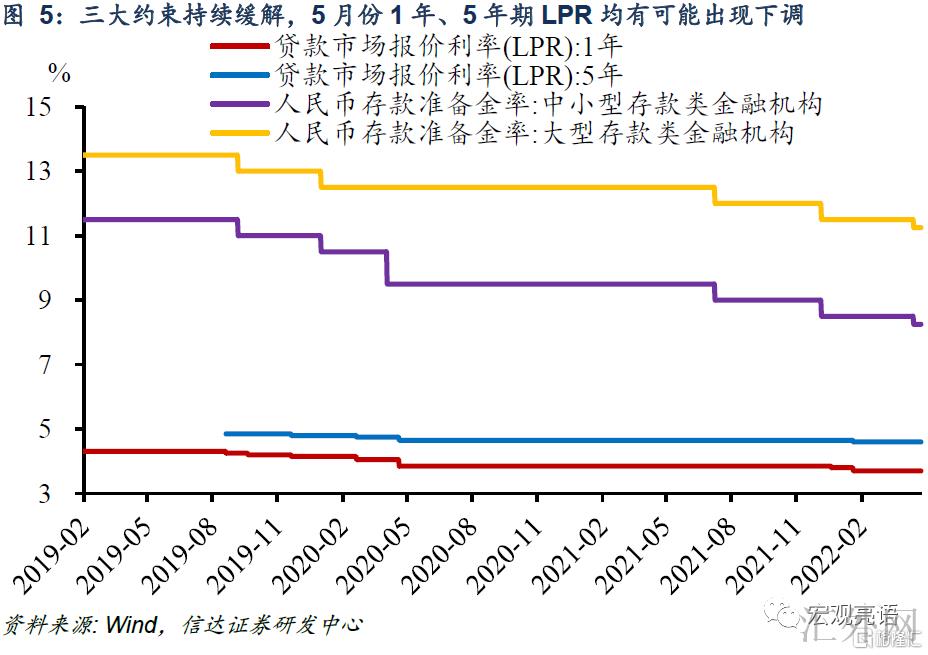 第五,银行信贷供给的流动性、资本和利率三大概束连续减轻,1年、5年期LPR均有向下调整空间。一季度以来,中央银行一是综合运用多类货币政策工具,维持流动性合理充足,减轻了流动性约束。二是以每月一次的频率平稳开展CBS操作,以永续债为击穿口助推银行补充资本,同期激励大型银行减弱拨备覆盖率,减轻了资本约束。三是“建立存款利率市场化调动机制”,推动存款利率更深一步市场化,4月最后一周(4.25-5.1),全国金融机构新发生存款加权平均利率为2.37%,较前一周下滑10个基点。至此,银行面对的流动性、资本、利率三大概束均有不同程度减轻,存在足够空间助推LPR更深一步向下调整。