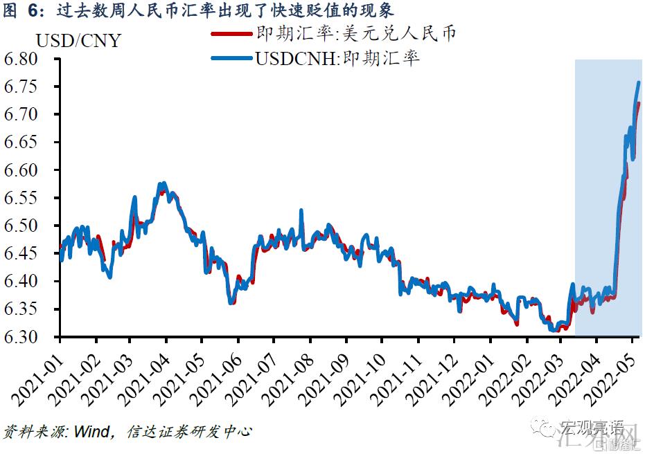 第七,汇率仍“以我为主”,中央银行或再次动用稳汇率政策工具。以往几周人民币汇率显现了迅速贬值现象,5月9号在岸即期汇率击穿6.7的转折点位。Q1数据中,中央银行有关汇率的定调依然是“以我为主”,一面这符合中国将稳上涨放在首位的政策风格,中央银行将持续维持货币政策独立性,为境内经济上涨创造宽松空间。另一面,中央银行不将对人民币汇率大幅贬值、迅速贬值坐视不管,下一阶段将“增强跨境资金流动宏观审慎管理,加深预计管理,处理好内部均衡和外部均衡的平衡”,或在向下调整外汇存准率后,再次动用其余稳汇率政策工具。