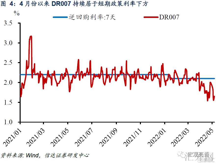 第四,中央银行上缴结存利润连续对流动性形成补充,预期短时间内流动性将保持稳中偏松。3月底超储率为1.7%,较上年同期高0.1个百分点,4月份以来,DR007连续位于短时间政策利率以下,反应出银行系统流动性稳中偏松。中央银行通过降准、上缴利润、MLF、再贷款等政策工具有效补充了流动性。5月10号中央银行国库局局长董化杰表明“2022年已上缴结存利润8000亿元,相当于降准0.4个百分点”。伴随中央银行持续上缴结存利润,预期流动性稳中偏松的局势将保持。