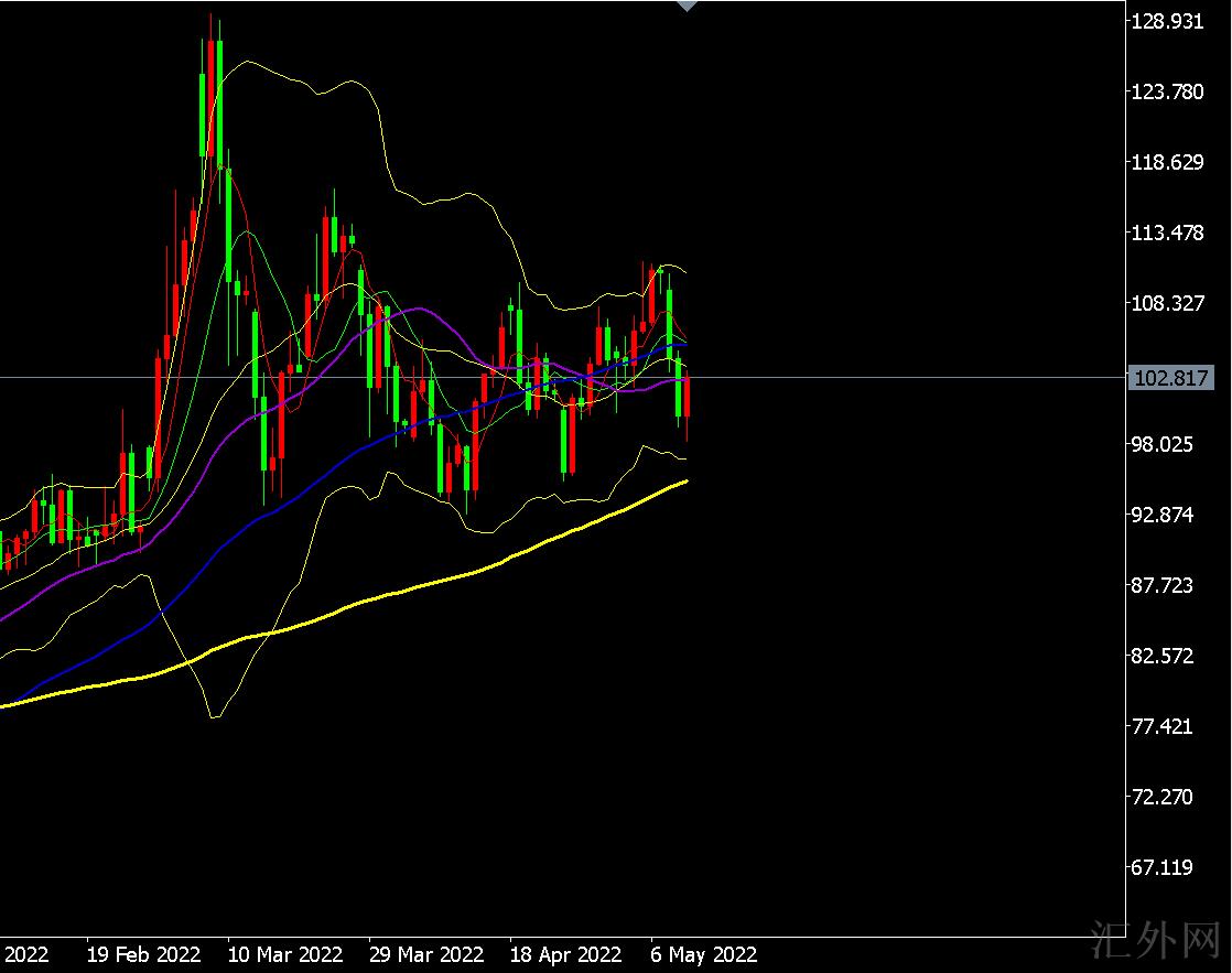 4小时看,当前宽幅整理局势,上方压力看120日移动均线104,强压力看60日移动均线105.2.以下支撑看布林下缘97.