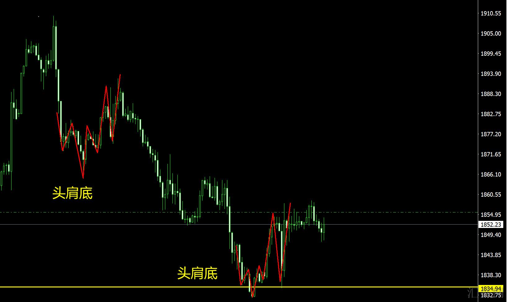 今日1860下方持续看空,1835一带由于头肩底形态完成,开始拉涨,但是在1858一带 1小时形成双顶,这与前面的1866左右的头肩底形态如出一辙。经典形态能否同样又一次发生,让我们持续注意1858的双顶情形。下方看1846-1836 突破1836 则会痛跌看1820-1815