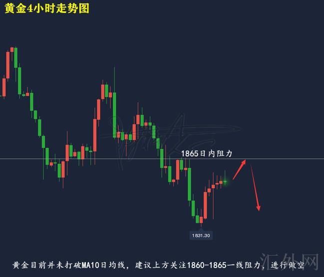 黄金技术分析来分析,日K线上,隔日黄金亚盘刷新新低后展开回涨,并在夜里刷新MA5日移动均线后适当回调,报得带上下影线的中阳,日K线上,今日行情开盘保持上涨趋势,但上方均线MA10仍未有效击穿,谨防遇阻回调;4小时上,隔日黄金在早间刷新新低后走震荡上涨行情持续上升,今日保持上涨趋势并刺破中轨,目前布林带马上收口,MA均线迈出金叉,KDJ随机指标三线往上,到达超买,MACD指标红色量能柱连续放量,快慢线金叉往上,综合来说,日间黄金短时间或上涨不足,日间交易参考回弹买跌,上方注意1860-1865一线压力。