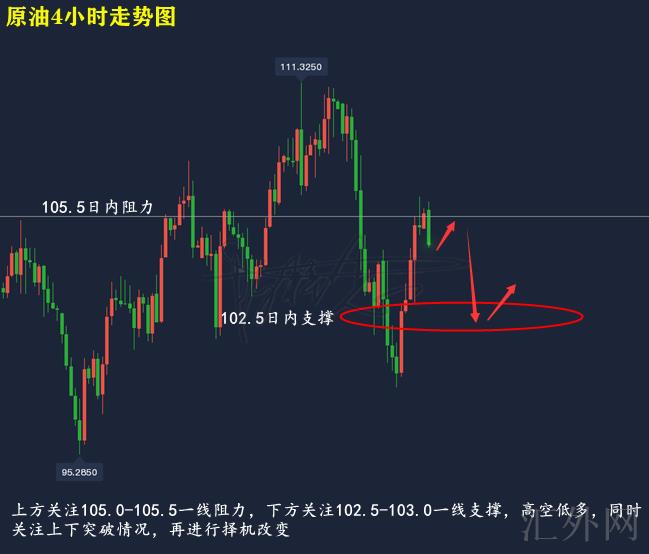 原油技术分析来分析,日K线上,隔日原油亚盘跌朝下轨位置后展开回涨,并刺破MA5日移动均线,报得大阳,日K线上,今日原油开盘适当回调,预期短时间仍有下探;4小时上,隔日原油亚盘刷新低点后走震荡上涨行情上升,盘中刺破中轨,目前布林带处在开口期,MA均线迈出双金叉,KDJ随机指标三线朝下,到达超买,MACD指标红色量能柱连续放量,快慢线金叉向前,综合来说,原油当前或短时间上涨不足,但以下均线支撑仍未刺破,日间交易参考高空低多,上方注意105.0-105.5一线压力,以下注意102.5-103.0一线支撑,同期关注上下击穿情形,若上方击穿,则顺势抬高支撑买涨,若以下击穿,短时间扩暴降幅,维持买跌。