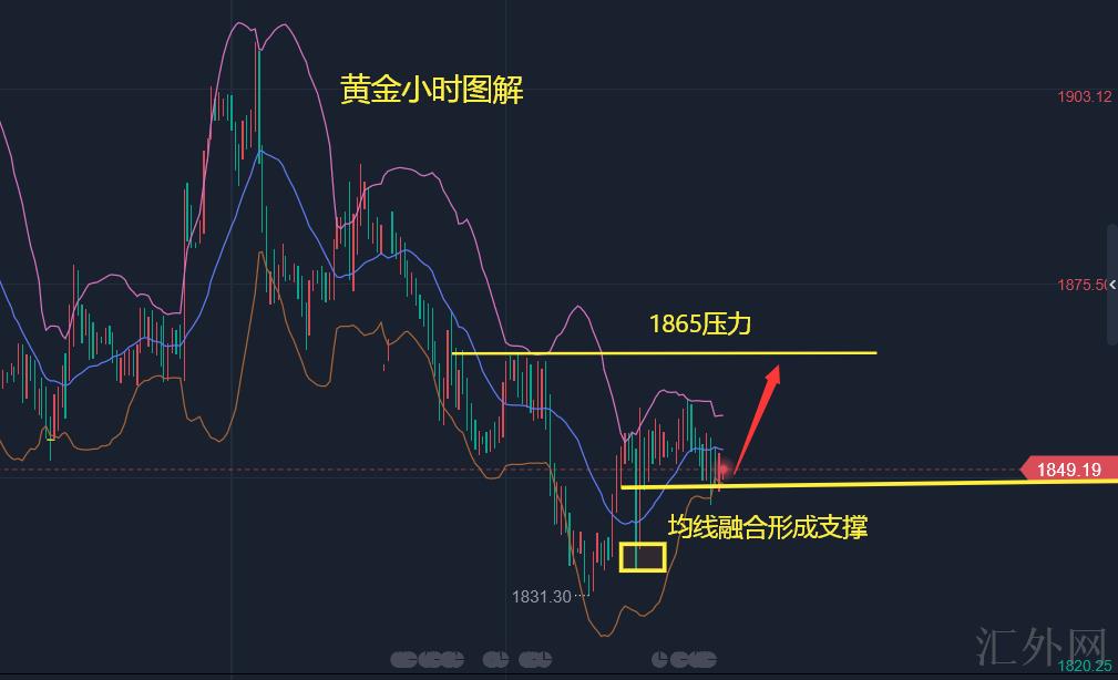 黄金小时图目睹均线已经融合,并形成有效的支持,支撑区域在1840名置,击穿后形成当下上升的支持,今日就以这一名置防守买涨看多,上方近期的阻力是1865的小横盘位置,日间的必到值。