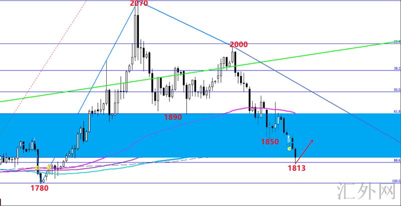 这周黄金遇阻1890保持下跌趋势,而且显现单边下探行情,最多跌穿1850关口,卖方开始增速走跌,连破1840—1835核心支撑到1830左右得以减轻下跌趋势。隔日黄金依托1832支撑,回弹重返1860关键点位执行技术分析修复。看似黄金有希望筑底回涨,可任然依旧未能力挽狂澜,最终遇阻1860关键点位持续走跌。最刺激的依旧美盘午夜行情,受鲍威尔连任美联储主席消息刺激,黄金遭受崩盘回调,又一次创下低位到1810关键点位,其下跌趋势又一次保持,尤为惊人!当下黄金跌穿1830核心支撑区域,卖方愈加如虎添翼,而且日K线大阴回调收尾。MA5—MA10均线依旧死叉下探抑制,布林带维持开口下探,灵动指标由超卖区往上修复运行;加上周线三连阴和月线冲顶回调奠定了卖方基础。局势上卖方趋势一目了然,然而今日星期五预计也不会再跌了,这周的降幅也差不多到了尾声,周尾有希望面临卖方获利吐回进而回弹回涨。今日着重注意1780—2070斐波那契0.886%的1813名置,可以在此以防守布局多单看回弹,当下4小时底部的锤子线依旧给出了买涨信号,上方注意1832左右阻力。