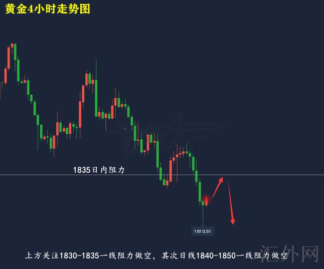黄金技术分析来分析,日K线上,隔日黄金在经历前一个交易日的回涨后,又一次遇阻MA10日移动均线展开下探,盘中报得带上影线的大阴,日K线上,今日早间行情再创下低1810.51美元一线,并随后回涨,但上方均线抑制较强,日间有希望持续试探千八关键点位;4小时上,隔日黄金在早间刺破中轨位置后走震荡下探行情,持续刺破下缘创下低,目前布林带马上开口,MA均线迈出双死叉,KDJ随机指标三线向前,MACD指标绿色量能柱连续放量,快慢线死叉朝下,综合来说,日间卖方强势,推荐依托1830-1835一线压力买跌,若显现上升,则再依托日K线1840-1850一线压力买跌。