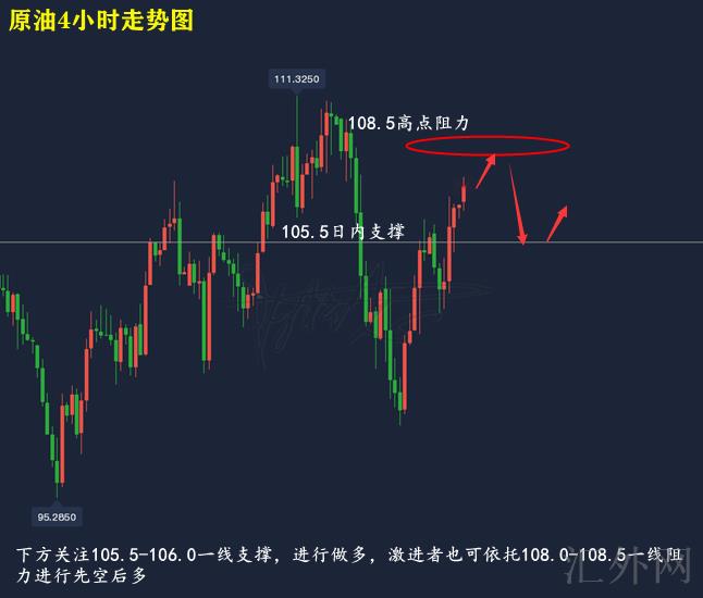 原油技术分析来分析,日K线上,隔日原油保持上涨趋势,在亚盘刺破中轨均线位置后回涨 ,报得带下影线的小阳,日K线上,今日行情开盘展开回涨,日间均线支撑维持完好,预期恐会持续依托上涨;4小时上,隔日原油在早间刺破中轨位置回调新低后走震荡上涨行情回涨,目前布林带马上开口,MA均线迈出双金叉,KDJ随机指标三线往上,到达超买,MACD指标红色量能柱连续放量,快慢线金叉往上,综合来说,原油当前短时间有回调需求,日间交易参考回撤买涨,以下注意105.5-106.0一线支撑,激进派也可依托日间高点108.0-108.5一线压力先空后多。