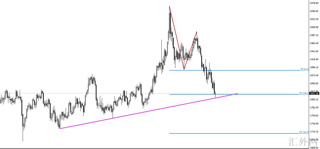 黄金星期四的下挫把星期三的回弹全部吞没,凌晨在鲍威尔发言后打出本来调动的低位1810.从降幅向上瞧,已经满足了日线图级别从2070--1890下挫的1:1降幅了。加之仍有趋势线的支持,理论上这里会目睹回弹的显现。