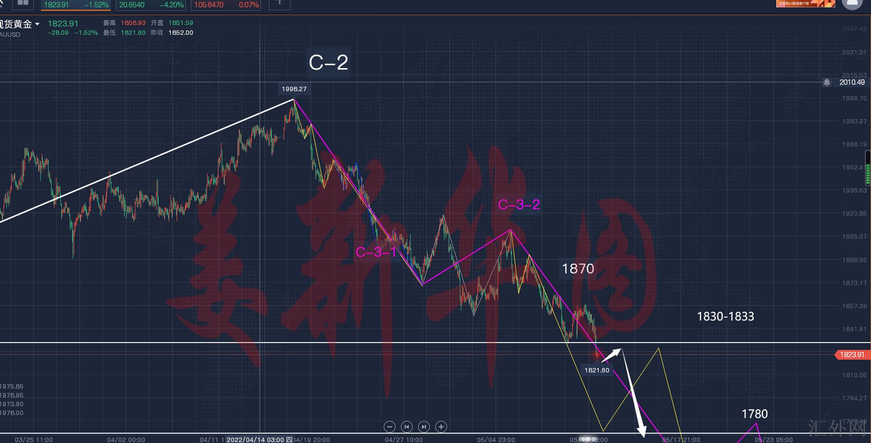 2、C-3-3浪细分:为方便分析,我们可将C-3-3浪又一次细分成5浪结构,如图中黄色线所示。依据已有行情,我们可判定行情已走完小时1浪和小2浪,正处在3浪增速下探当中。根据波浪理论推演:小3浪的理论底部位于1780左右,其事实底部需依据实盘裸k信号和其余技术指标确定。但我们可确定的是,行情整体仍处在弱势下探当中,后市仍可持续看下探。