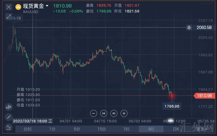 星期五(5月13号)早盘亚盘,黄金现货15分钟下跌10美元,逼差不多1810美元每盎司。报告表明,COMEX最活跃黄金期货合约北京时间5月13号06:27一分钟内买做空盘面瞬间成交2310手,交易合约总价值4.20亿美元。伴随美联储在6月份会议上大幅加息的机会性持续提升,金价连续下挫。抛压态势预期将牵累黄金价格接差不多1800.00美元的心理支撑。美联储主席鲍威尔星期四重申,在将来两次会议上加息半个百分点或许是合适之举,然而中央银行随时准备依据接收到的报告更改路径。鲍威尔在接受专访被问及他能否已消除加息75个基点时重申了他在5月4号记着招待会上的讲法:“假使经济表现与预计吻合,那么在接下去的两次会议上再加息50个基点就将是合适的。总体来说;美元指数星期四扩暴上涨趋势,刷新20年高峰。美元上升令以美元计算的黄金遇阻。