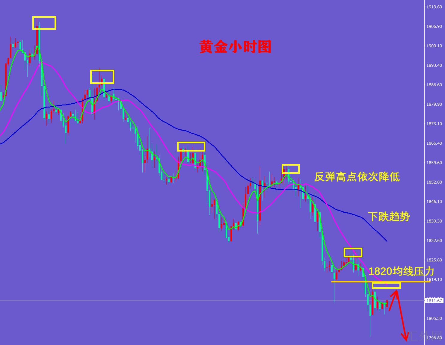 黄金小时图上可以目睹,回弹的高位依次减弱,趋势下挫无疑。回弹一直承受均线的抑制,当下近期的阻力是1820名置。星期五下跌趋势1800名置后执行了回弹,但强度显著不足,和在此之前的回弹并无二致。1800毕竟是整数关键点位,有回弹或者调动均为正常,下周也是先看回弹随后持续又一次空。