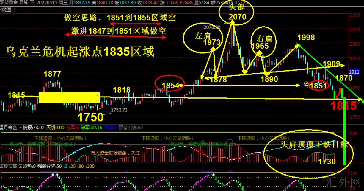 首先恭喜1883上星期一路空和星期五1828闭眼空的粉丝,计划1700时代昨日按计划兑现,又是丰收的日子,世界资产承受抛压,数字货币均为闪崩,美联储加息75基点言论再起,起码6到7月接连加息50基点大约率同期伴随缩表起步世界资产又一次重新推到从来,所以黄金跟随下挫预计之内,诚然上缘1833区域没有抵抗持稳,那么黄金差不多回归1700时代,也即是说1833区域是乌克兰危机避险起涨点,后期就是成强压位置,日K线从2070到顶以来是头肩顶技术形态,下挫计划位置1730区域仍有段距离。也即是说这周顶底转换1832到1835区域成又一次买跌区域,顺势回弹进场就好,买方在1851突破显现十几亿大单出逃,短时间很难显现买方连续做多盘,所以趋势空行情,回弹阻力反复空,不要去看支撑,支撑在下挫趋势均为给突破的,黄金一路震荡下挫两个月无数人去抄底,不少人都不理解为何我们持续提示反复买跌,趋势空暴涨大空,小涨小空,突破回弹追空。