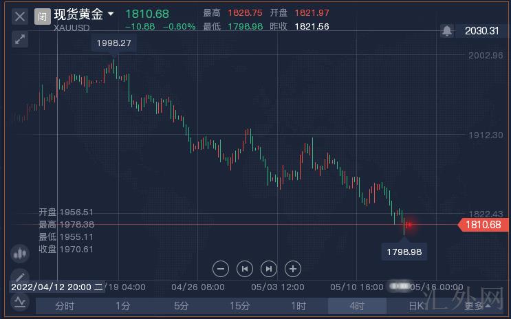 黄金消息面解析:星期五(5月13号),金价走跌,收盘在2月4号迄今的最低水准,且这周为接连第4周下挫,因美元攀升抵消了黄金作为通货膨胀对冲工具的吸引力。美市收盘,黄金现货收报得1811.41元/盎司,下挫10.22美元或0.56%,日间最高刷新1828.71美元每盎司,最低刷新1798.97美元每盎司。这周,黄金现货下挫71.52美元或3.80%,为2021年6月中旬以来最糟心的单周表现。分析专员表明,黄金价格当前在1800美元附近,或许面对更大的抛压风险。黄金价格在星期四跌穿1830美元的支持点后,承受技术性抛压阻力的牵累。美元上升,以及美国发布好于预计的通货膨胀报告后,市场预计美联储将执行激进动作,也让该贵金属遇阻。