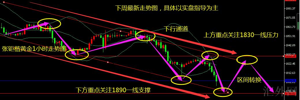 今日,星期五,持续买跌的思路。不要去怕,张钜楷依旧稍微把握的,黄金的低位不是1810,黄金的低位还没出来。下滑趋势通道是我们的一个根据。如下所示: