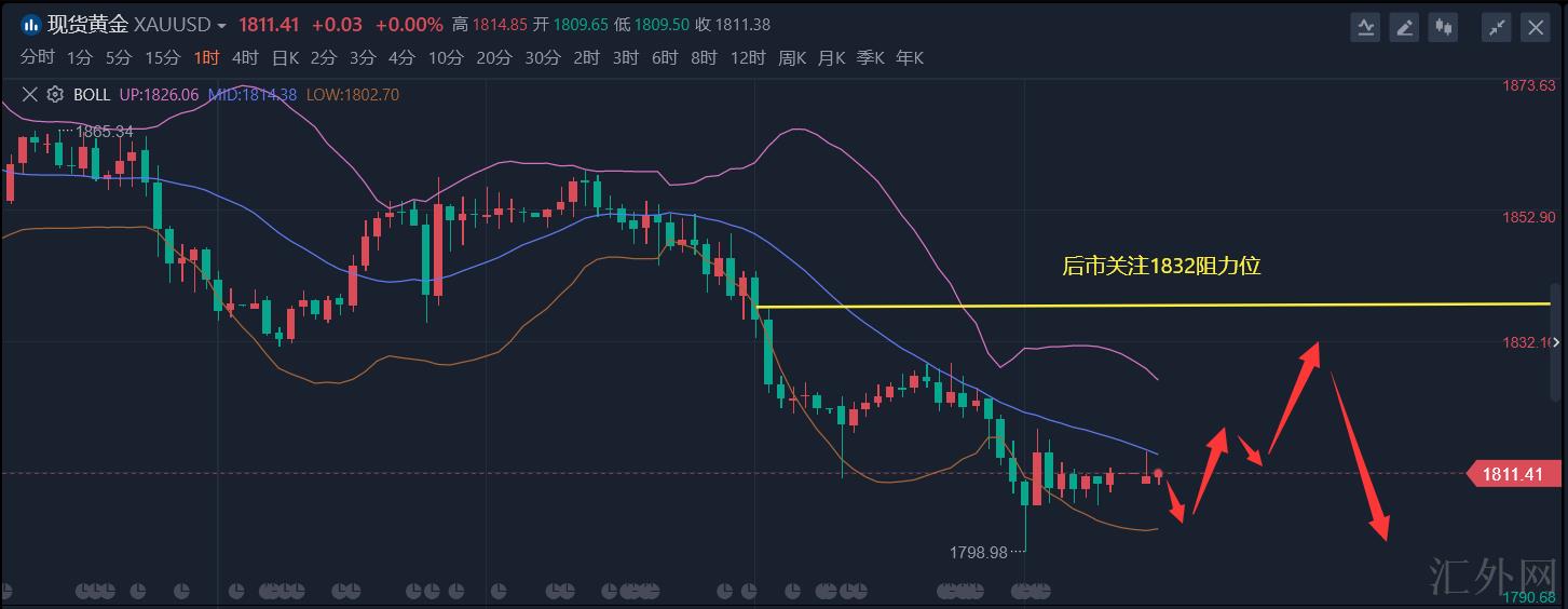 黄金技术分析分析:上星期五周线收官,黄金给出4周连阴,周线已形成技术性死叉,卖方趋势更深一步加深中。黄金日K图向上瞧,收线连续连阴单阳,到底信号仍未显现,单日上升反而形成卖方增速的号角,当前价格完全朝下击穿200日移动均线,卖方看跌展望更为强烈,1800关键点位已经不足够对卖方组成威胁,下一计划1780。从目前日K线形态看,短时间阻力注意5均线1835一线,也是趋势反压点,此外就是1823一线开跌口,支撑集中1798-95区域,当前黄金在1798止跌回弹;短时间依旧保持弱势局势,只然而降幅靠近前期起涨点左右,也也快到最后多处底部趋势衍生密集处也就是1780一线左右,此处存在随时超跌回弹的几率,道氏论金个人预计黄金刷新1780左右会面临一次不错的中线机会。黄金4小时线向上瞧,价格远离短时间均线,布林带开口朝下连续散发,同期MACD绿色量能柱连续放量,快慢线远离0轴死叉运行中,4小时线上,买方已经溃败,卖方趋势占领绝对优势,但以下1780极强支撑恐怕会令下周黄金价格给出适当的回弹。短线层面黄金昨日突破下挫,黄金目前反抽无力,以下仍有下挫空间!4小时图低点轻微启稳回弹,短线不消除执行回弹拉锯,又一次下探要等吐回昨日的区域,破低后面才可更深一步保持,不然短线容易保持在低位上方执行修正。操作上一定要顺势而为,综上所述,今日黄金交易参考上道氏论金推荐回弹高空为主,回踩低多为辅,上方着重注意1825-1830一线压力,以下短时间着重注意1800-1795一线支撑。