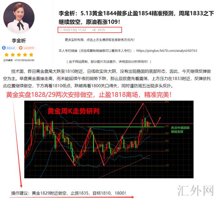 5.13 上星期五美盘圆满收官,日间博文中黄金清晰提到1829买跌,完美抓住高位,盘中安排实盘1828/29两次开空,在1818止盈大赚,整体收获150点!